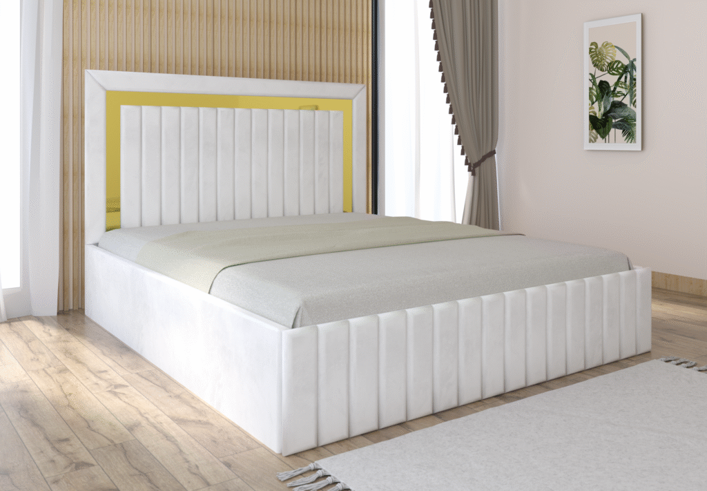 Pat tapitat Matei Alb Stofa cu oglinda Gold