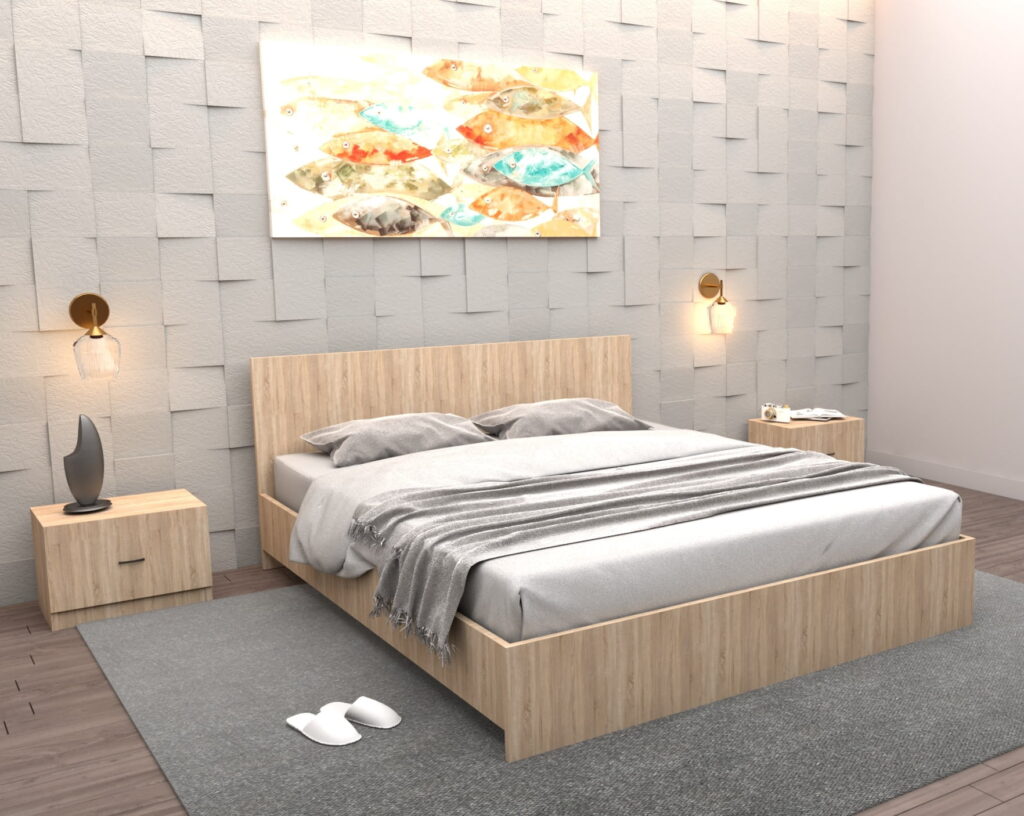 Completează-ți spațiul cu un dormitor modern, compus din pat matrimonial tapițat și dulap spațios cu uși glisante, ideal pentru un ambient curat, aerisit și rafinat. Perfect pentru un stil modern!