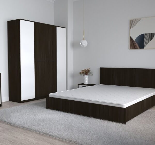 Dormitor Lorena Wenge Alb cu comoda TV Wenge,Pat Matrimonial Wenge, Dulap David Alb Wenge si Noptiere Wenge