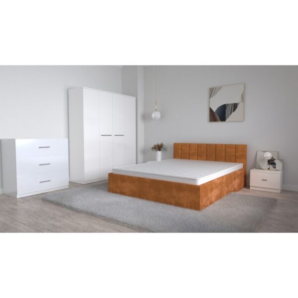 Set Dormitor Oliver Alb cu pat tapitat Caramiziu Dulap Lorena 4 usi Noptiere si Comoda TV 3 sertare