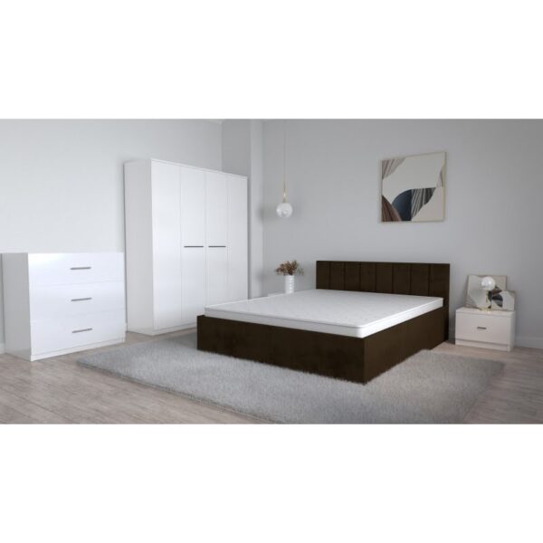Set Dormitor Oliver Alb cu pat tapitat Maro inchis Dulap Lorena 4 usi Noptiere si Comoda TV 3 sertare