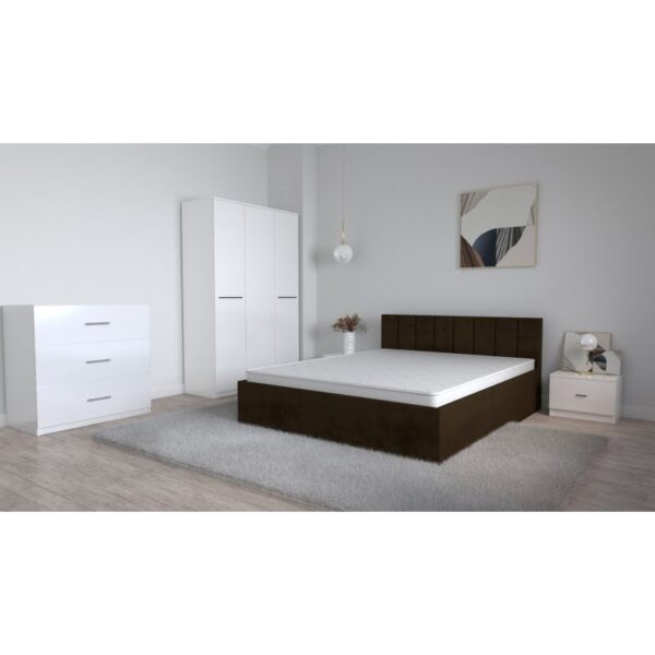 Set Dormitor Oliver Alb cu pat tapitat Maro inchis Dulap Lorena 3 usi Noptiere si Comoda TV 3 sertare