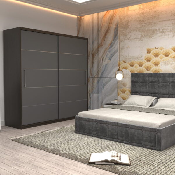 Dormitor Regal cu Pat Matrimonial Gri Stofa Dulap usi glisante 200 x 200 cm Wenghe cu usi Gri Fara Oglinda Noptiere si comoda TV