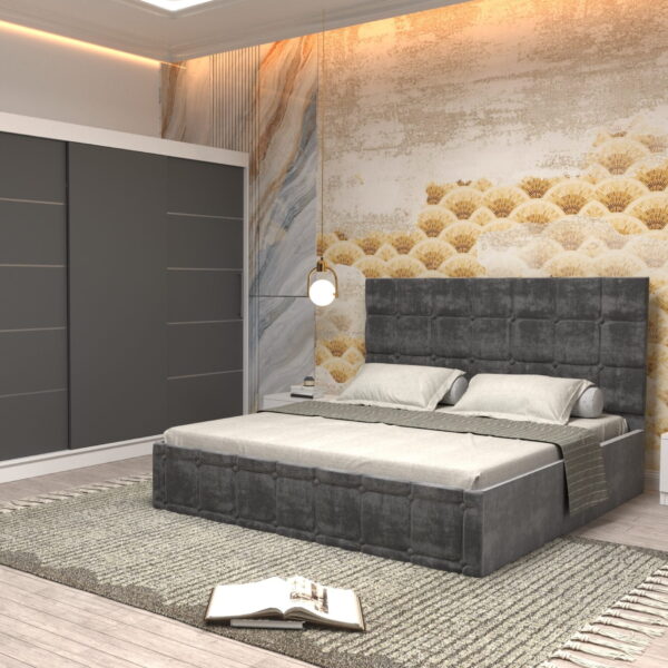 Dormitor Regal cu Pat Matrimonial Gri Stofa Dulap Gold usi glisante 200 x 200 cm Wenghe cu usi Albe Fara Oglinda Noptiere si comoda TV