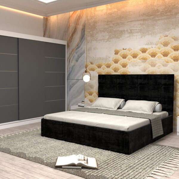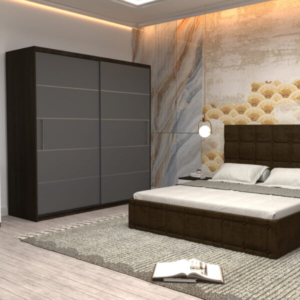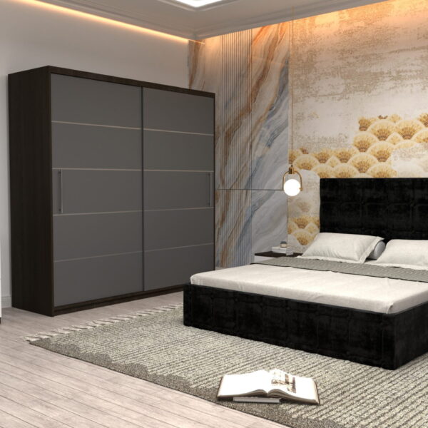Dormitor Regal cu Pat Matrimonial Negru Stofa Dulap usi glisante 200 x 200 cm Wenghe cu usi Gri Fara Oglinda Noptiere si comoda TV