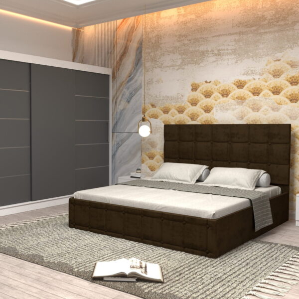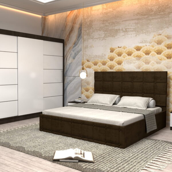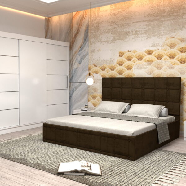 Dormitor Regal cu Pat Matrimonial Maro Stofa Dulap usi glisante 200 x 200 cm Wenghe cu usi Gri Fara Oglinda Noptiere si comoda TV