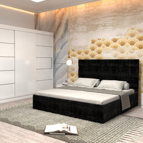 Dormitor Regal cu Pat Matrimonial Negru Stofa Dulap usi glisante 250 x 200 cm Alb cu usi Albe Fara Oglinda si Noptiere