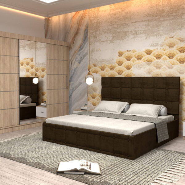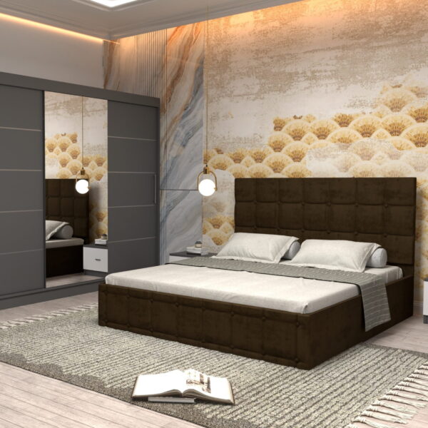 Dormitor Regal cu Pat Matrimonial Maro Stofa Dulap usi glisante 250 x 200 cm Wenghe cu usi Albe Cu Oglinda si Noptiere