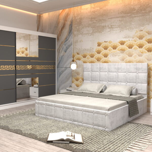 Dormitor Regal cu Pat Matrimonial Alb Stofa Dulap Gold usi glisante 250 x 200 cm Alb cu usi glisante Gri cu Oglinda si Noptiere si comoda TV