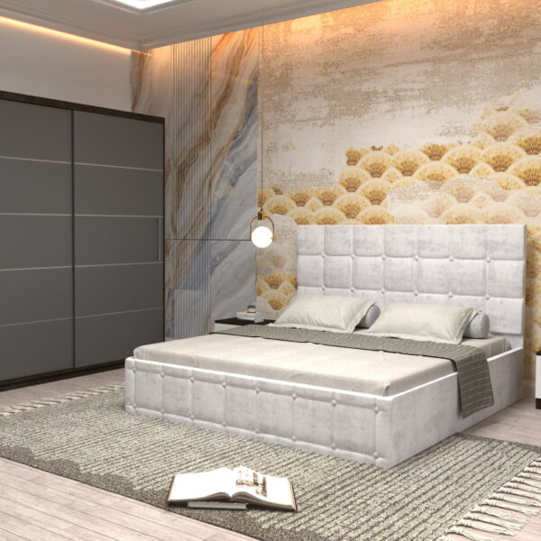 Dormitor Regal cu Pat Matrimonial Alb Stofa Dulap usi glisante 200 x 200 cm Wenghe cu usi glisante Gri Fara Oglinda si Noptiere