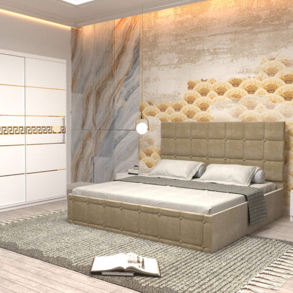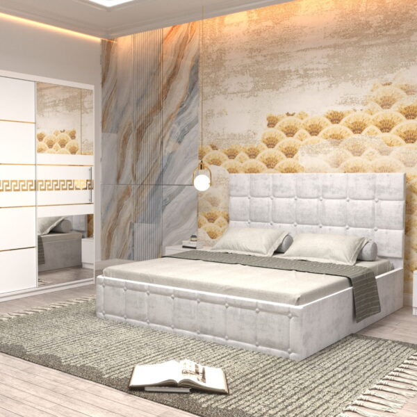 Dormitor Regal cu Pat Matrimonial Bej Stofa Dulap Gold usi glisante 150 x 200 cm Alb cu usi Albe Cu Oglinda si Noptiere