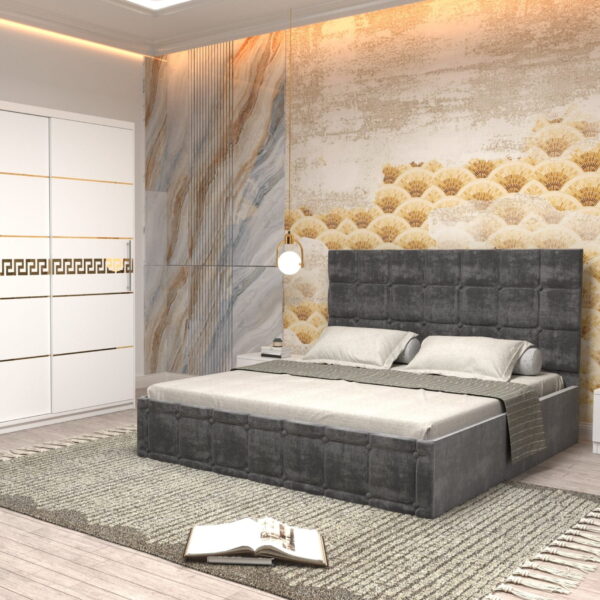 Dormitor Regal cu Pat Matrimonial Negru Stofa Dulap usi glisante 200 x 200 cm Wenghe cu usi Gri Fara Oglinda si Noptiere