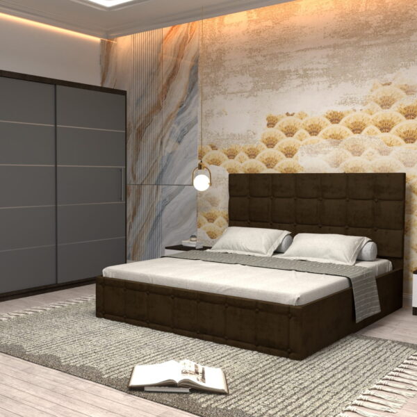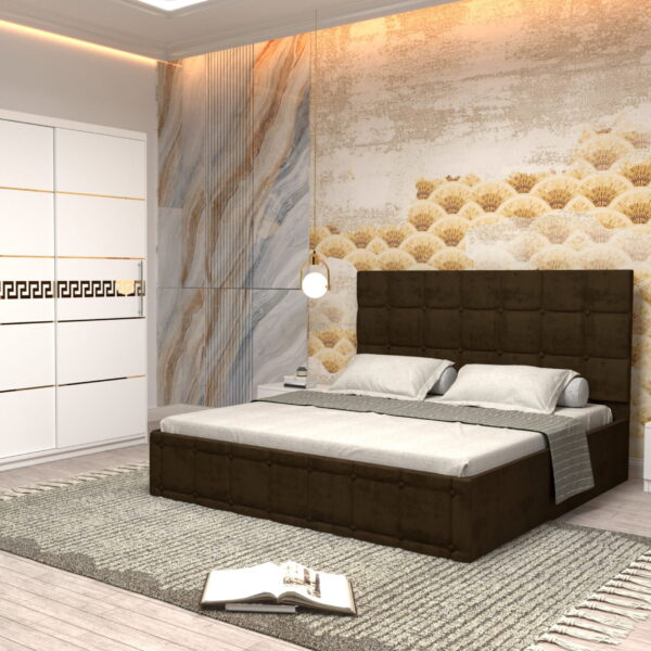 Dormitor Regal cu Pat Matrimonial Maro Stofa Dulap usi glisante 200 x 200 cm Wenghe cu usi Gri Fara Oglinda si Noptiere