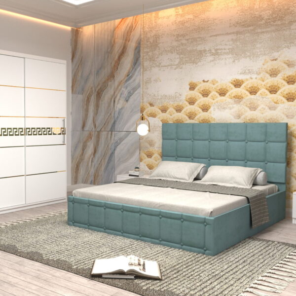 Dormitor Regal cu Pat Matrimonial Turcoaz Stofa Dulap Gold usi glisante 150 x 200 cm Alb cu usi Albe Fara Oglinda si Noptiere