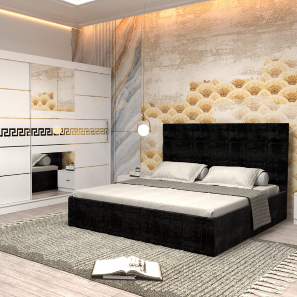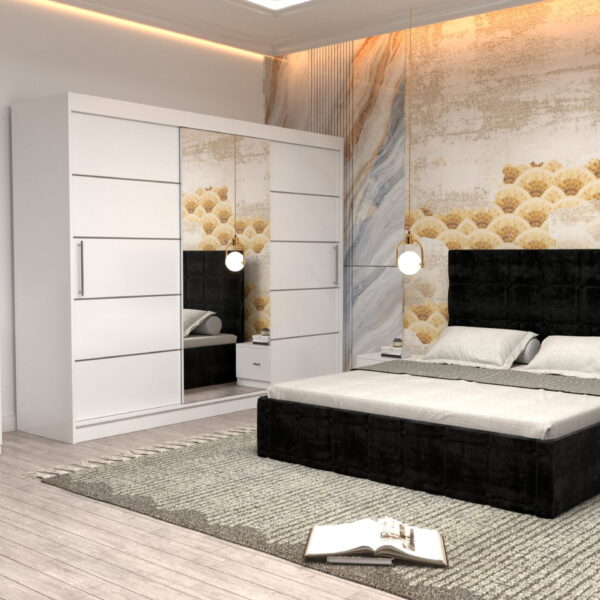 Dormitor Regal cu Pat Matrimonial Negru Stofa Dulap Gold usi glisante 250 x 200 cm Alb cu usi Albe Cu Oglinda si Noptiere