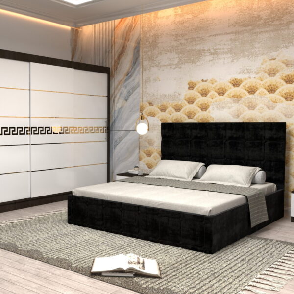 Dormitor Regal cu Pat Matrimonial Negru Stofa Dulap Gold usi glisante 250 x 200 cm Wenghe cu usi Albe Fara Oglinda Noptiere si comoda TV