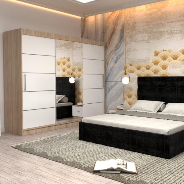 Dormitor Regal cu Pat Matrimonial Negru Stofa Dulap usi glisante 250 x 200 cm Sonoma cu usi Albe Cu Oglinda si Noptiere