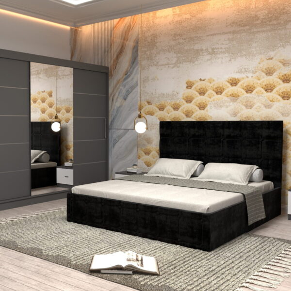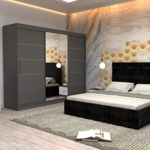 Dormitor Regal cu Pat Matrimonial Negru Stofa Dulap usi glisante 250 x 200 cm Gri cu usi Gri Cu Oglinda si Noptiere comoda TV