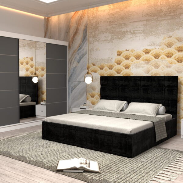 Dormitor Regal cu Pat Matrimonial Negru Stofa Dulap usi glisante 250 x 200 cm Alb cu usi Gri cu Oglinda si Noptiere