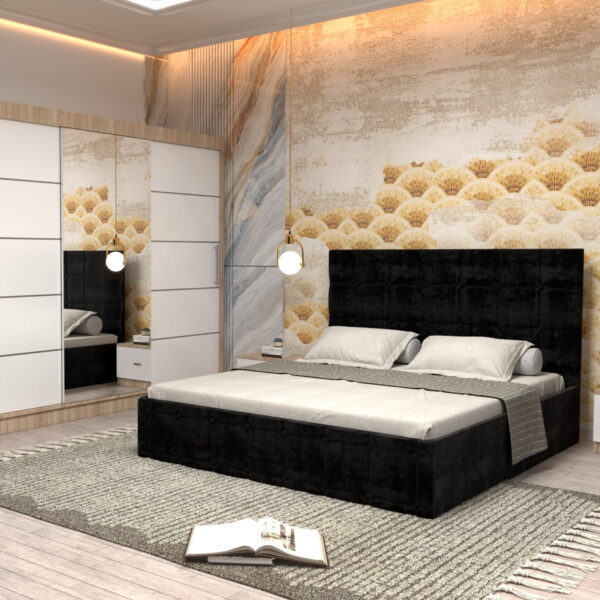 Dormitor Regal cu Pat Matrimonial Negru Stofa Dulap usi glisante 250 x 200 cm Wenghe cu usi Albe Cu Oglinda Noptiere si comoda TV
