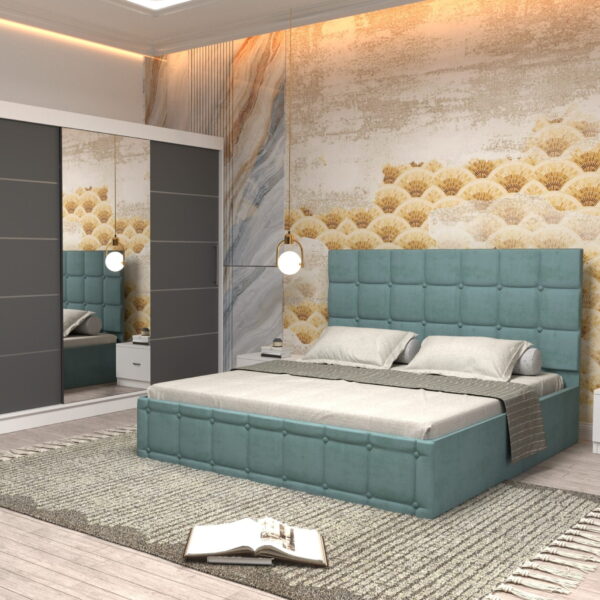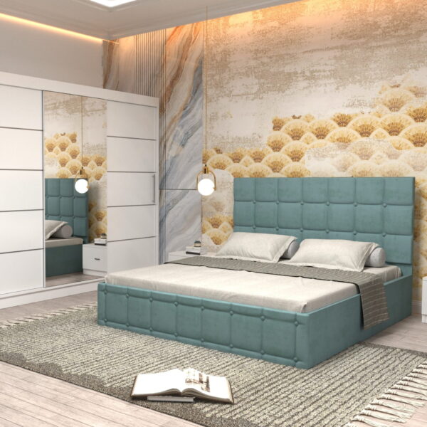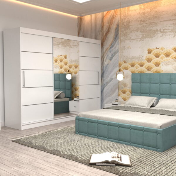 Dormitor Regal cu Pat Matrimonial Turcoaz Stofa Dulap Gold usi glisante 250 x 200 cm Alb cu usi Gri cu Oglinda si Noptiere