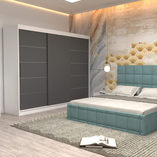 Dormitor Regal cu Pat Matrimonial Turcoaz Stofa Dulap usi glisante 250 x 200 cm Alb cu usi Gri cu Oglinda Noptiere si comoda TV