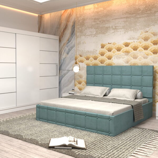 Dormitor Regal cu Pat Matrimonial Turcoaz Stofa Dulap usi glisante 200 x 200 cm Wenghe cu usi Gri Fara Oglinda Noptiere si comoda TV
