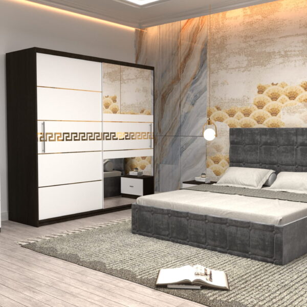 Dormitor Regal cu Pat Matrimonial Gri Stofa Dulap Gold usi glisante 200 x 200 cm Wenghe cu usi Albe Cu Oglinda Noptiere si comoda TV