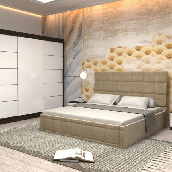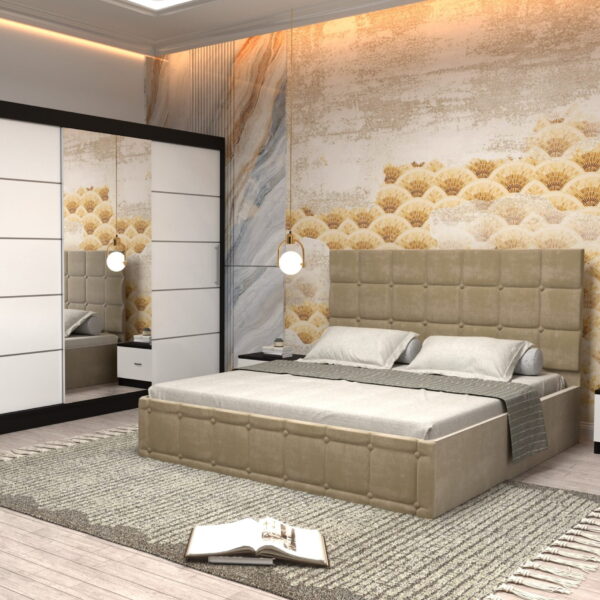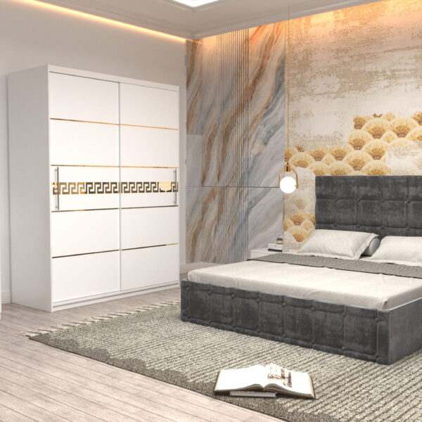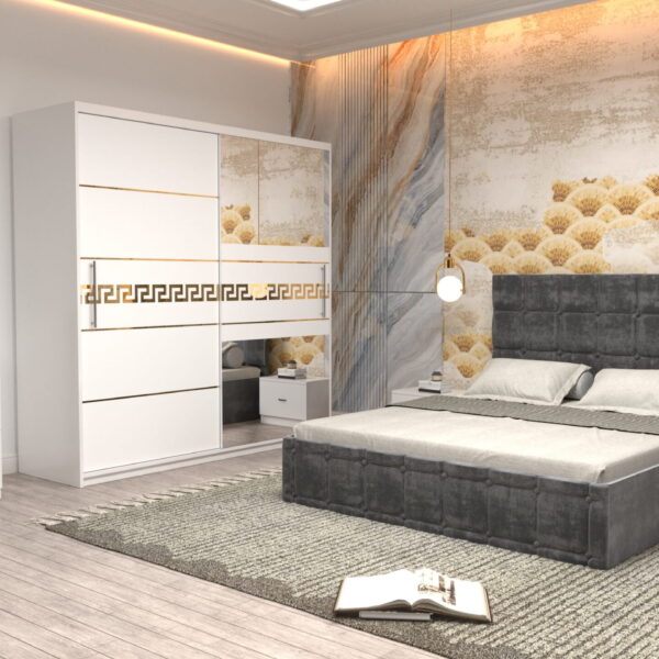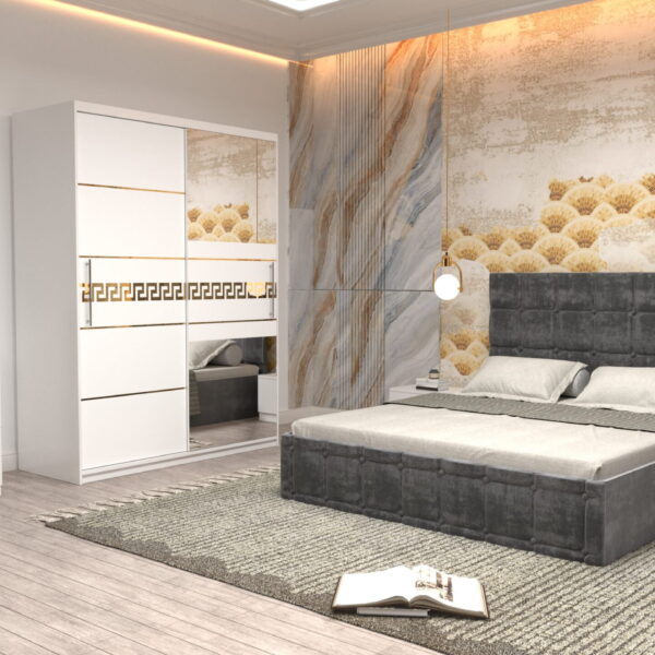 Dormitor Regal cu Pat Matrimonial Gri Stofa Dulap Gold usi glisante 200 x 200 cm Alb cu usi Albe Cu Oglinda Noptiere si comoda TV