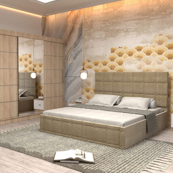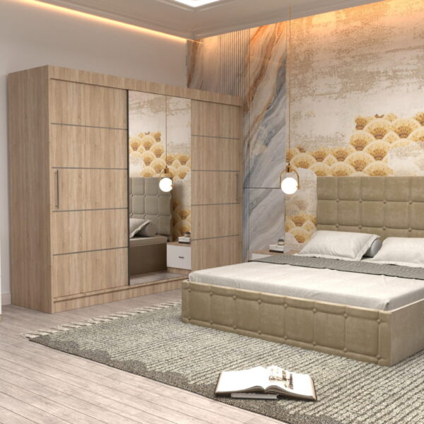 Dormitor Regal cu Pat Matrimonial Bej Stofa Dulap usi glisante 250 x 200 cm Sonoma cu usi Sonoma Cu Oglinda si Noptiere