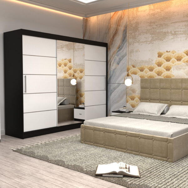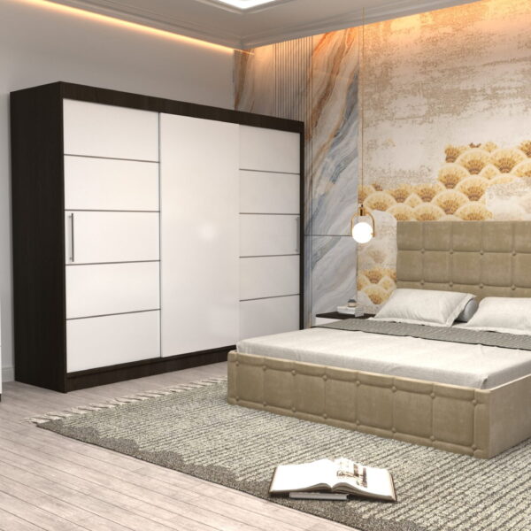 Dormitor Regal cu Pat Matrimonial Bej Stofa Dulap usi glisante 250 x 200 cm Wenghe cu usi Albe Cu Oglinda si Noptiere