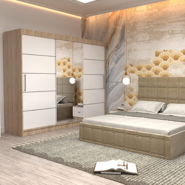 Dormitor Regal cu Pat Matrimonial Bej Stofa Dulap usi glisante 250 x 200 cm Sonoma cu usi Albe Cu Oglinda si Noptiere