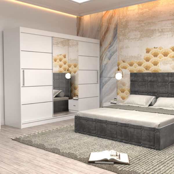 Dormitor Regal cu Pat Matrimonial Gri Stofa Dulap Gold usi glisante 250 x 200 cm Alb cu usi Albe Cu Oglinda si Noptiere