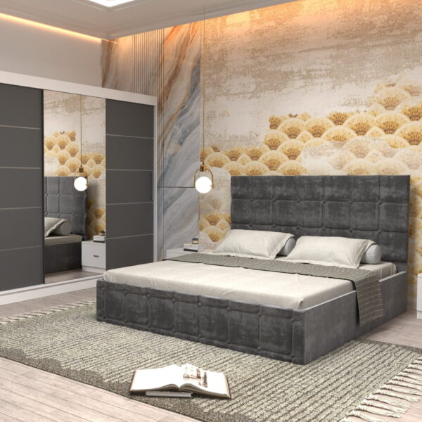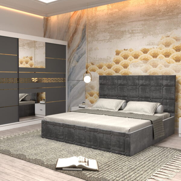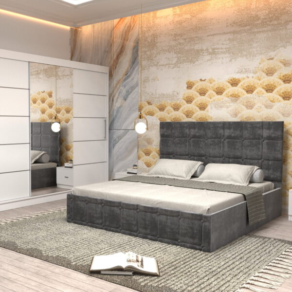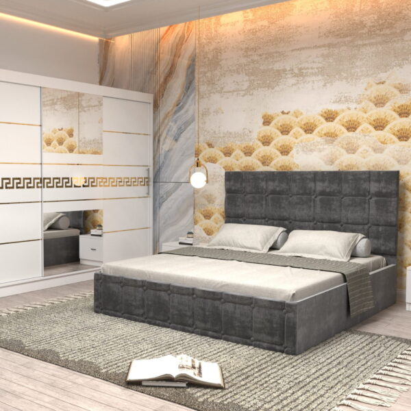 Dormitor Regal cu Pat Matrimonial Gri Stofa Dulap Gold usi glisante 200 x 200 cm Alb cu usi Albe Cu Oglinda si Noptiere