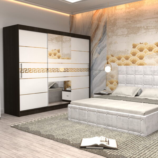 Dormitor Regal cu Pat Matrimonial Alb Stofa Dulap Gold usi glisante 250 x 200 cm Wenghe cu usi glisante Albe Cu Oglinda si Noptiere
