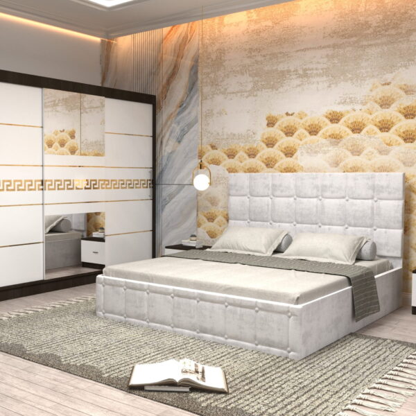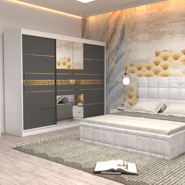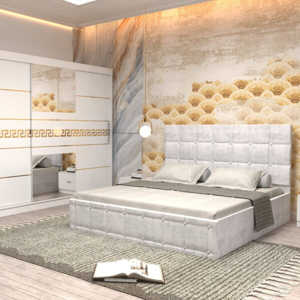 Dormitor Regal cu Pat Matrimonial Alb Stofa Dulap Gold usi glisante 250 x 200 cm Alb cu usi glisante Gri cu Oglinda si Noptiere si comoda TV