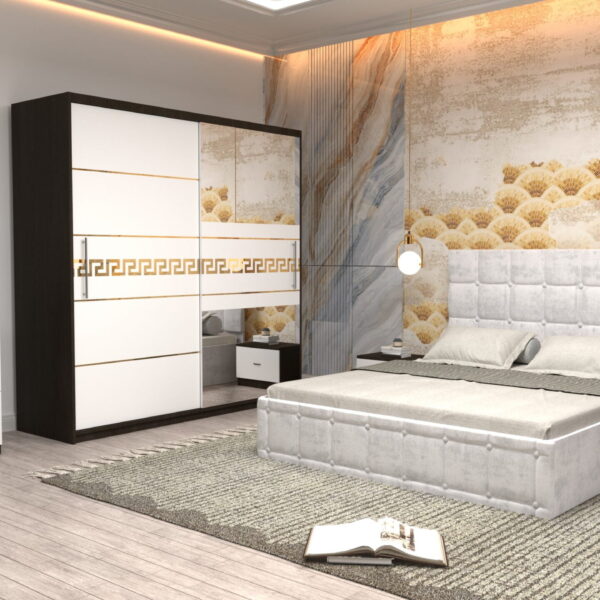 Dormitor Regal cu Pat Matrimonial Alb Stofa Dulap Gold usi glisante 200 x 200 cm Wenghe cu usi glisante Albe Cu Oglinda si Noptiere