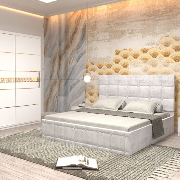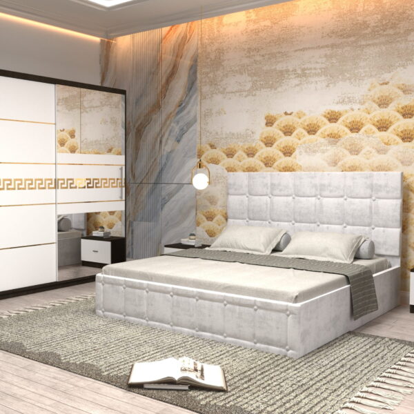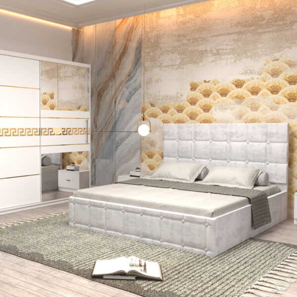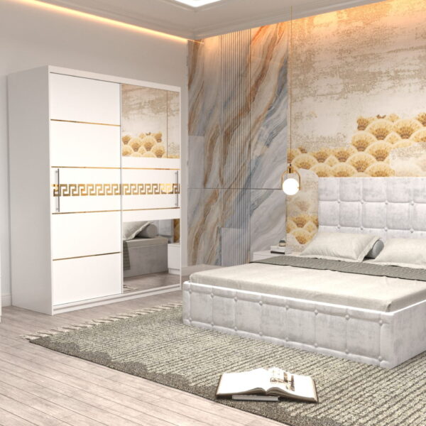 Dormitor Regal cu Pat Matrimonial Alb Stofa Dulap Gold usi glisante 200 x 200 cm Alb cu usi glisante Albe Cu Oglinda Noptiere si comoda TV