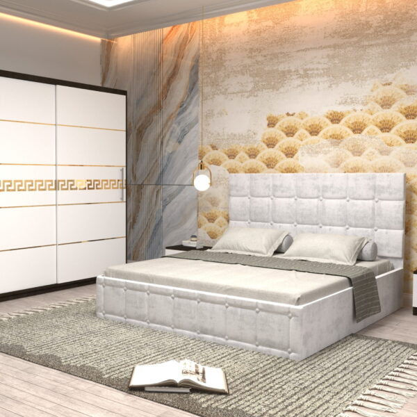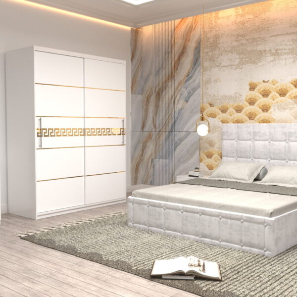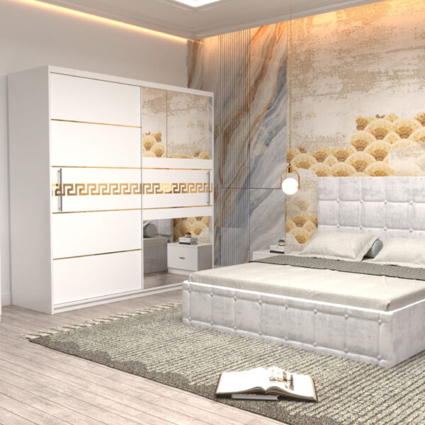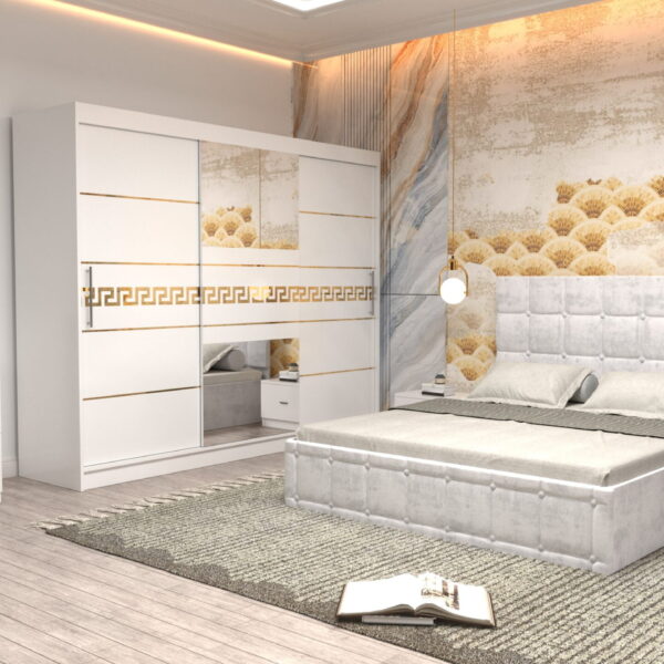 Dormitor Regal cu Pat Matrimonial Alb Stofa Dulap Gold usi glisante 250 x 200 cm Alb cu usi glisante Albe Cu Oglinda Noptiere si comoda TV