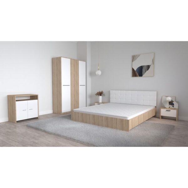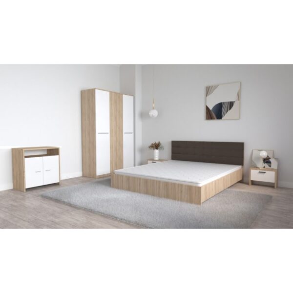 Set Dormitor Coral Stejar sonoma cu tablie tapitata Alba Dulap Lorena 3 usi Noptiere si Comoda TV Lorena