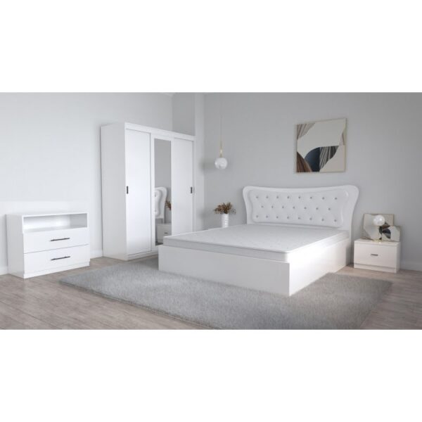 Dormitor Dante Magia Alb cu Pat Matrimonial 160 cm x 200 cm Dulap 4 usi Lorena Noptiere si comoda tv 3 sertare