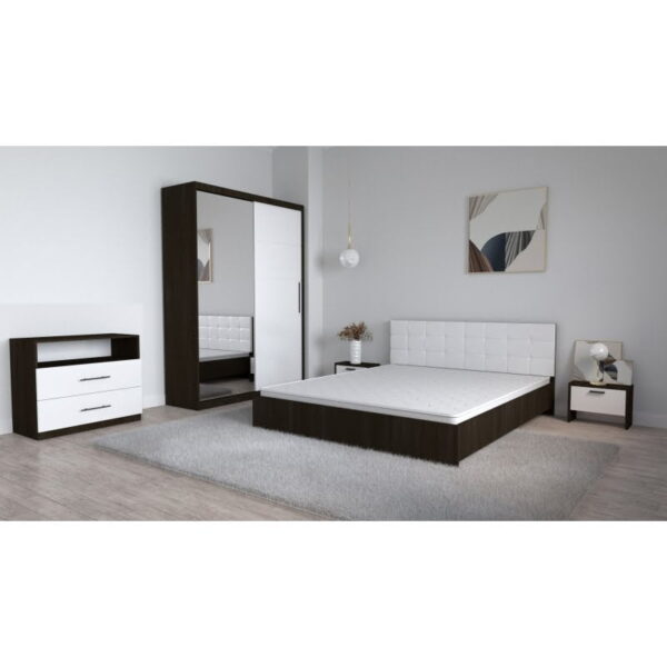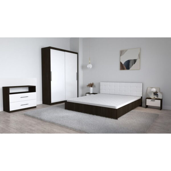 Set Dormitor Coral Wenghe cu tablie tapitata Alba Dulap Lorena 4 usi Noptiere si Comoda TV Lorena