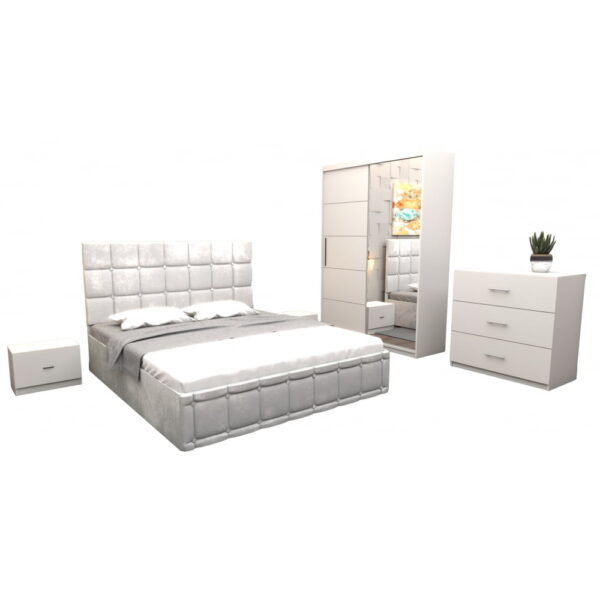 Set Dormitor Oliver Alb cu Pat Tapitat Vernil Stofa Dulap Lorena 4 usi Noptiere si comoda Tv 3 sertare