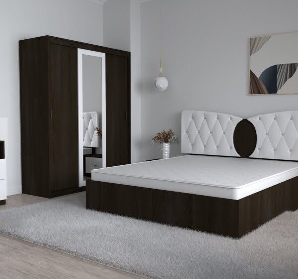 Dormitor Kent Magia Alb cu Pat Matrimonial 160 cm x 200 cm Dulap 3 usi Glisante cu Oglinda Noptiere si Comoda Tv Lorena