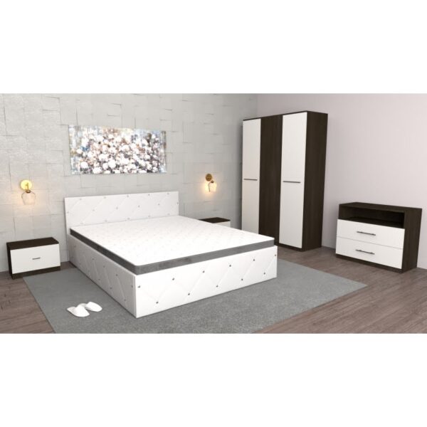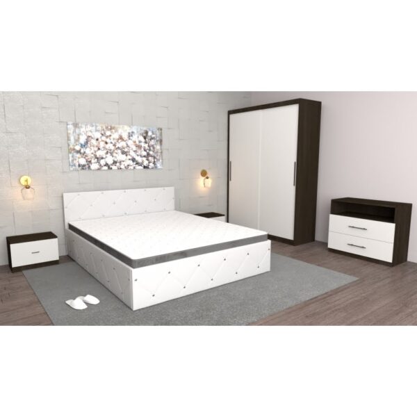 Dormitor Milano Alb Wenge cu comoda tv Wenge,Dulap usi glisante cu oglinda Wenge, Pat Matrimonial Alb si Noptiere Wenge