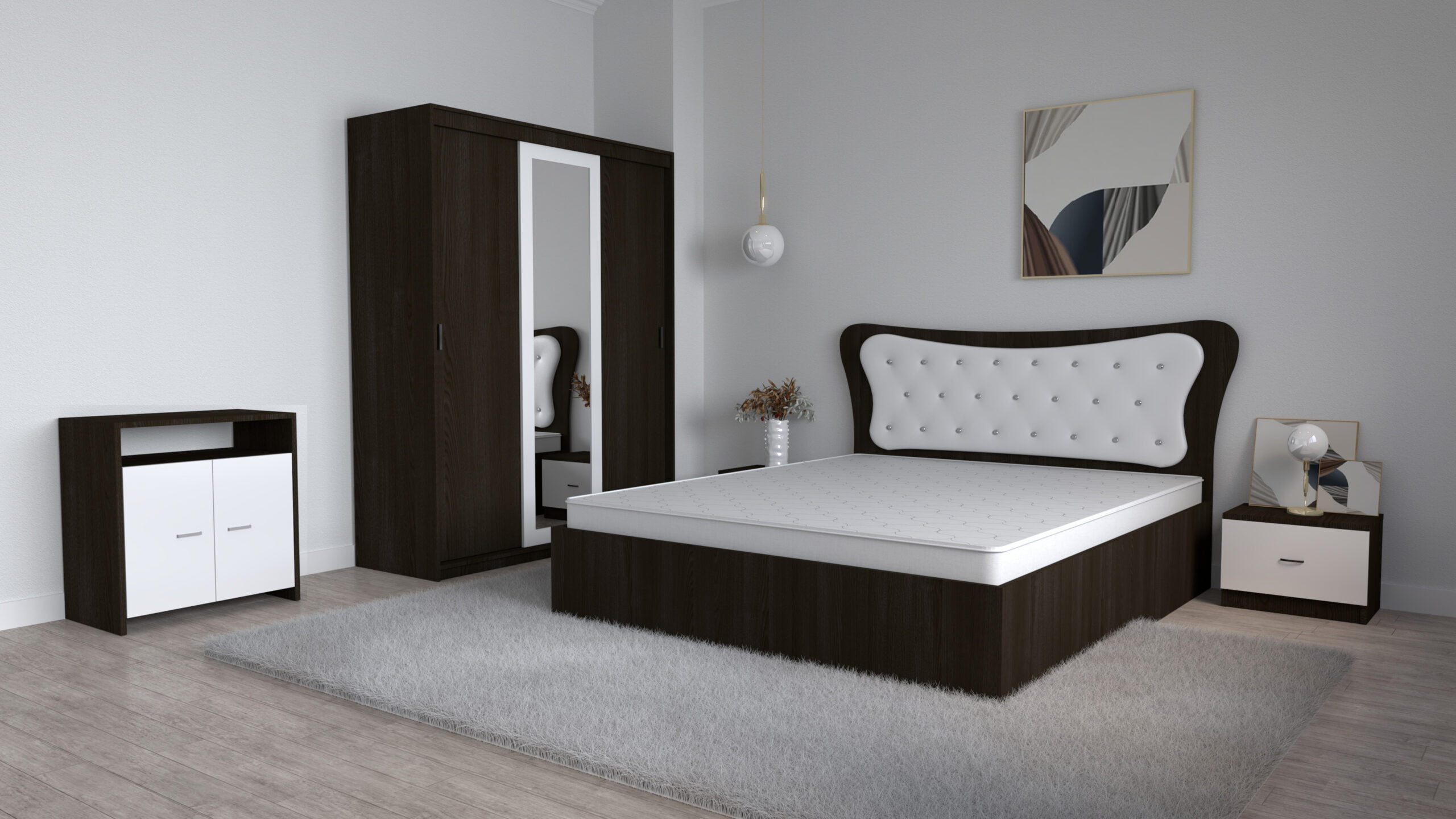 Dormitor Dante Magia Alb cu Pat Matrimonial 160 cm x 200 cm Dulap Usi Glisante Royal cu oglinda Noptiere si comoda tv Lorena