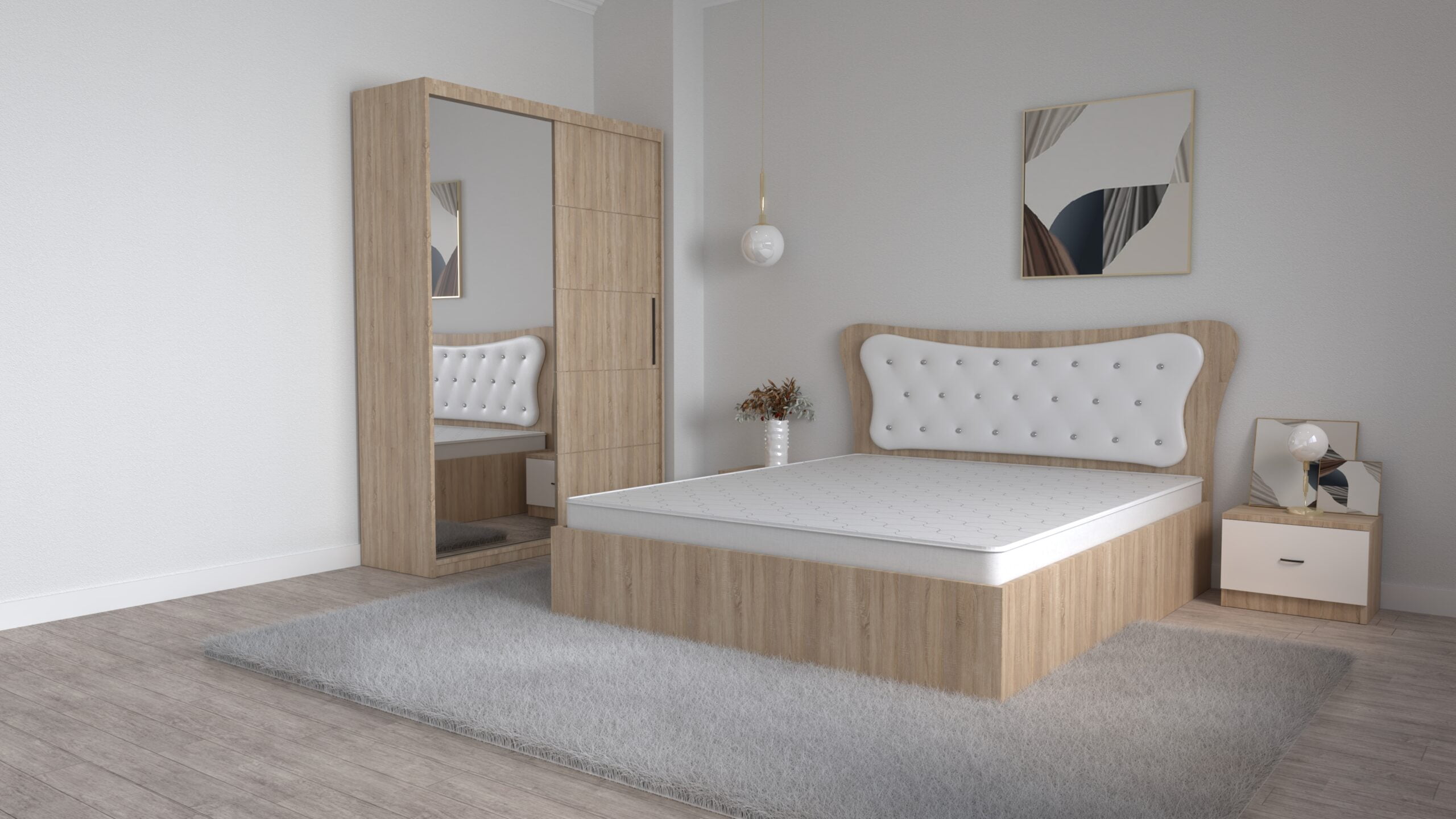 Dormitor Dante Stejar Sonoma Alb cu Pat Matrimonial 160 cm x 200 cm Dulap doua usi glisante cu oglinda si Noptiere