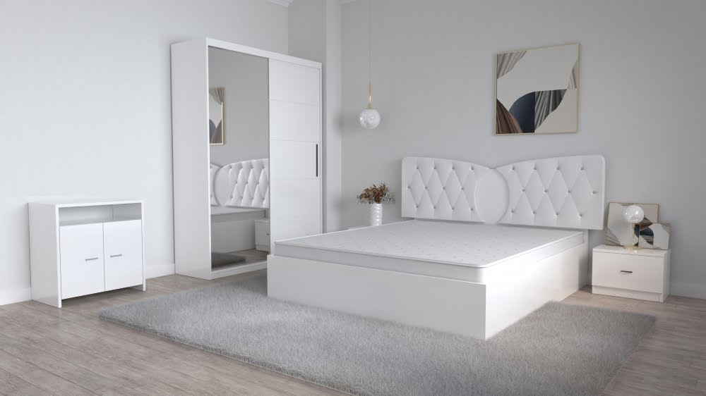 Dormitor Kent Alb cu Pat Matrimonial 160 cm x 200 cm Dulap 2 usi Glisante cu oglinda Noptiere si Comoda tv Lorena
