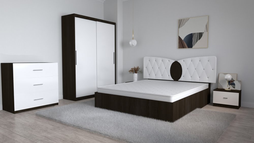 Culoare: Alb, Tip: Pat Matrimonial, Dimensiune: 160 cm x 200 cm, Dulap: 2 usi glisante fara oglinda, Noptiere: Da, Comoda tv: 3 Sertare.