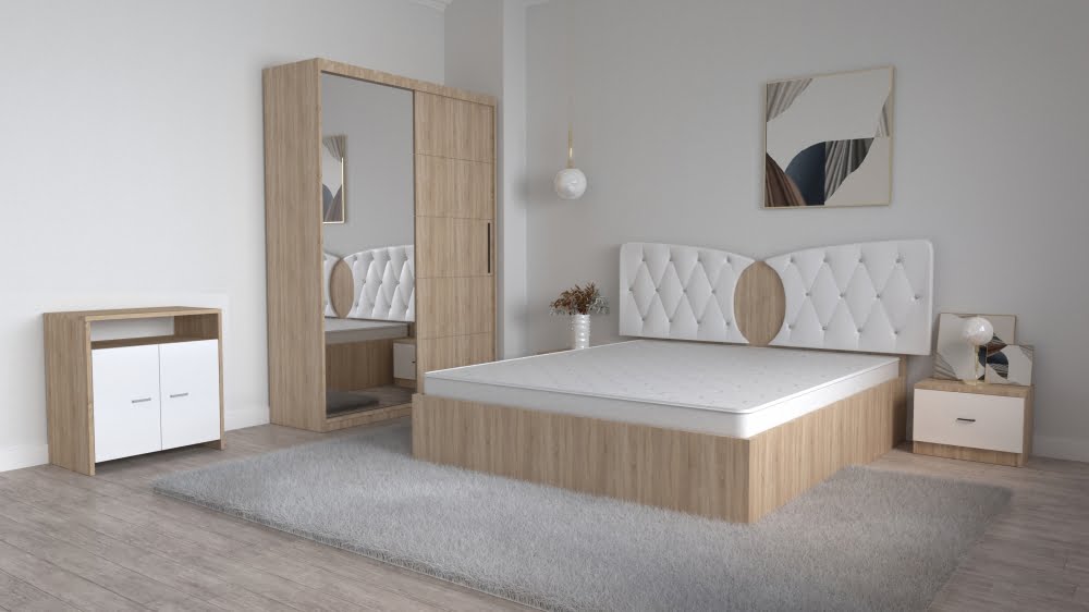 Tip: Dormitor, Culoare: Alb, Marca: Kent, Model: Sonoma, Pat: Matrimonial, Latime Pat: 160 cm, Lungime Pat: 200 cm, Dulap: 2 usi Glisante, Oglinda: Da, Noptiere: Da, Comoda tv: Lorena